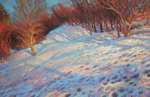 5. Susan: You and Steve would enjoy an afternoon chat together about snow and its myriad colors and reflections and aspects and emotions — all in something that someone else would call “white.” Late Spring Snowpack is in the home of a collector who purchased it from the Western Art Association Fine Art Auction, and he was kind enough to call us and tell Steve how much he enjoys looking at the work, and especially that snow.
