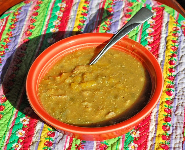 Soup is fast, easy, cheap, nutritious, and flexible. If you don’t have some of the ingredients, don’t worry: use rice instead of quinoa; pumpkin in place of delicata squash; leftover chicken instead of a frozen chicken thigh. Vary your spices, depending upon what’s in the cupboard and what you like.