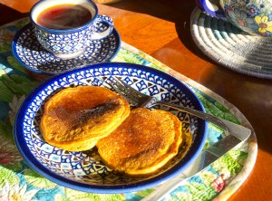 Lucky you — I originally was going to give you just one recipe — that for Pumpkin Pancakes — but as that only uses part of a 15 ounce can of pumpkin and you’d be standing at the kitchen counters, disconsolately wondering what to do with the rest of this stuff, I’m adding a bonus recipe for Pumpkin Ice Cream.