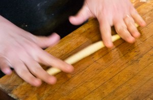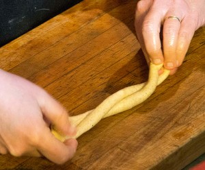 After an hour, punch the dough, turn it over, then pull it out of the bowl and cut it in half. Put one half back in the bowl, and cut the remaining half into 24 pieces. On a flat surface, roll each small piece into a long snake, shaping it with your hands. When you get two snakes, twist them together tightly and place on a greased cookie sheet. The first thing the twists will do is untwist, but they won’t completely come apart.