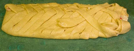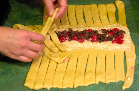 This picture shows you 1) how the coffeecake is divided in thirds, 2) the cuts along the side, 3) the space in the middle for the filling, and 4) the beginnings of how to start “weaving” the strips over the middle, right to left, right to left. Photo courtesy Steve Henderson Fine Art.