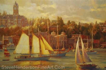 A sense of gentle nostalgia imbues the air at the Port Townsend Wooden Boat Festival. Harbor Faire, original oil painting by Steve Henderson, sold.