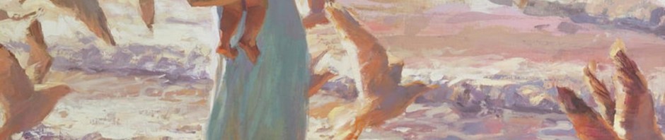 The artwork, Taking Flight, is an invitation to us to look beyond the shallow world of advertising, propaganda, politics, inane entertainment, fearmongering, and the mis-information dis-information diversion of what calls itself “the news.” A young woman stands in the surf, holding close her child (who like all normal children is curious, active, and wriggling) as a flock of gulls takes flight in her midst. It’s a mysterious moment, a fanciful one, and it is a reminder to us that life is precious and beautiful indeed, and it is a gift given to all humans on this earth, not just the powerful and parasitic few.